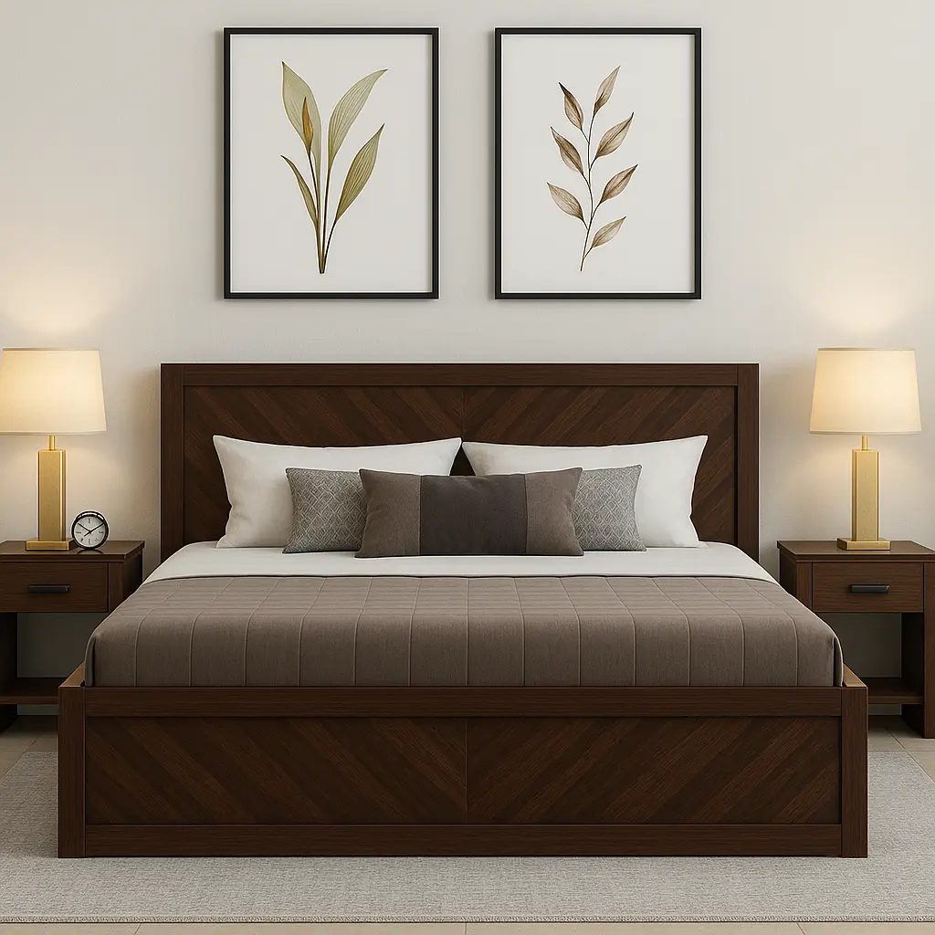 Verona Dark Walnut Premium Bed is the perfect blend of luxury and modern aesthetics, designed to transform your bedroom into a stylish sanctuary. Crafted with elegance and detailed craftsmanship, this bed features a sleek herringbone pattern on a rich dark walnut finish, paired with modern side tables for a complete look.